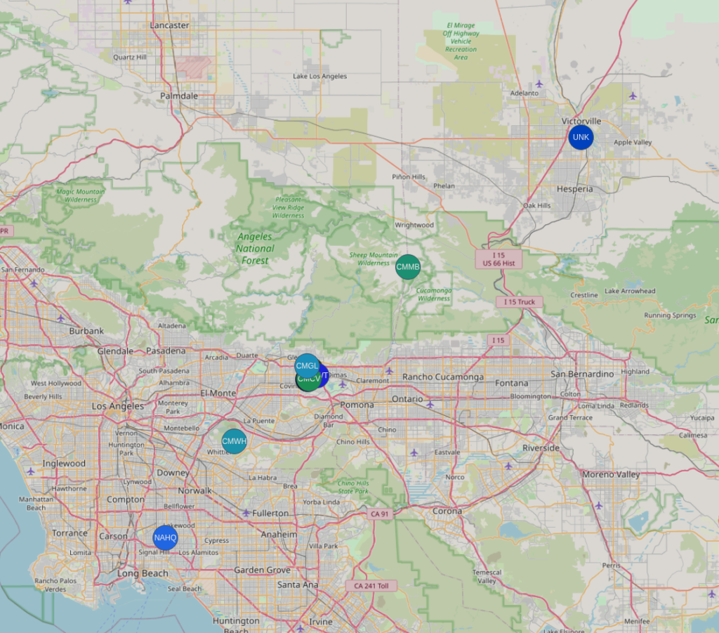 Looking at the map below, you can see there is a cluster of nodes in the eastern San Gabriel Valley where many of us are based. However, there are nodes all over desert Los Angeles County, and pushing further east into San Bernardino County.